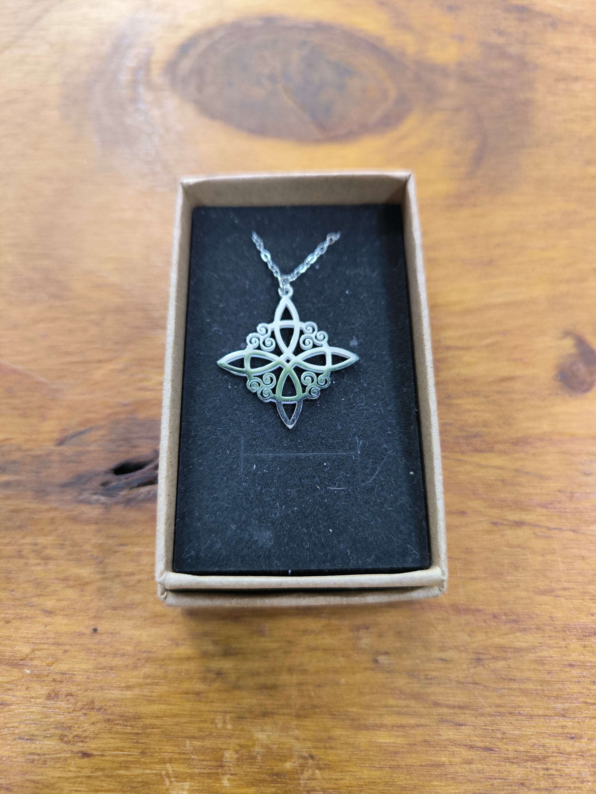 Colgante en acero plateado de Nudo De Bruja. Este amuleto representa la unión y conexión de las fuerzas elementales de la naturaleza, el aire, el fuego, el agua y la tierra. Es un amuleto de protección que trae a nosotros las fuerzas elementales para que nos llenen con su energía y nos cuiden de todo mal y peligro, devolviendo a su fuente la energía negativa o dañina.