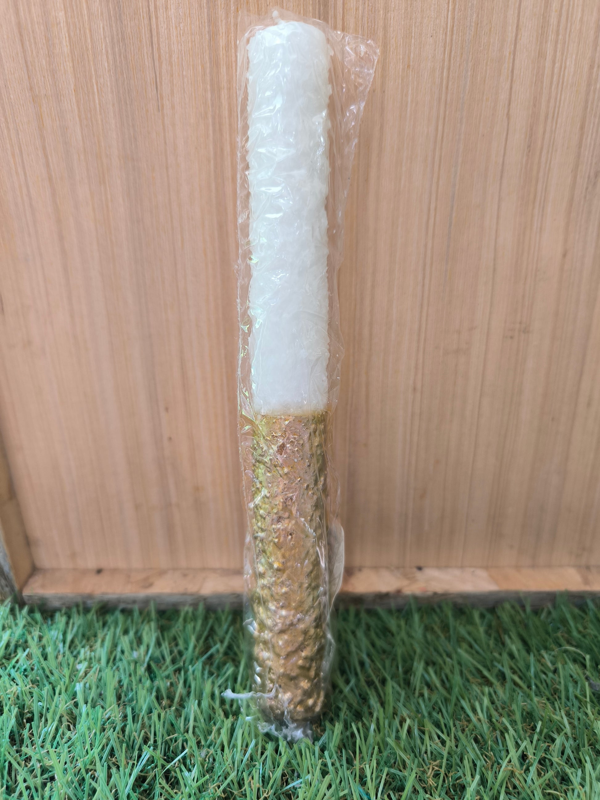Vela blanca elaborada con ceras naturales, ruda, romero, salvia y sal.