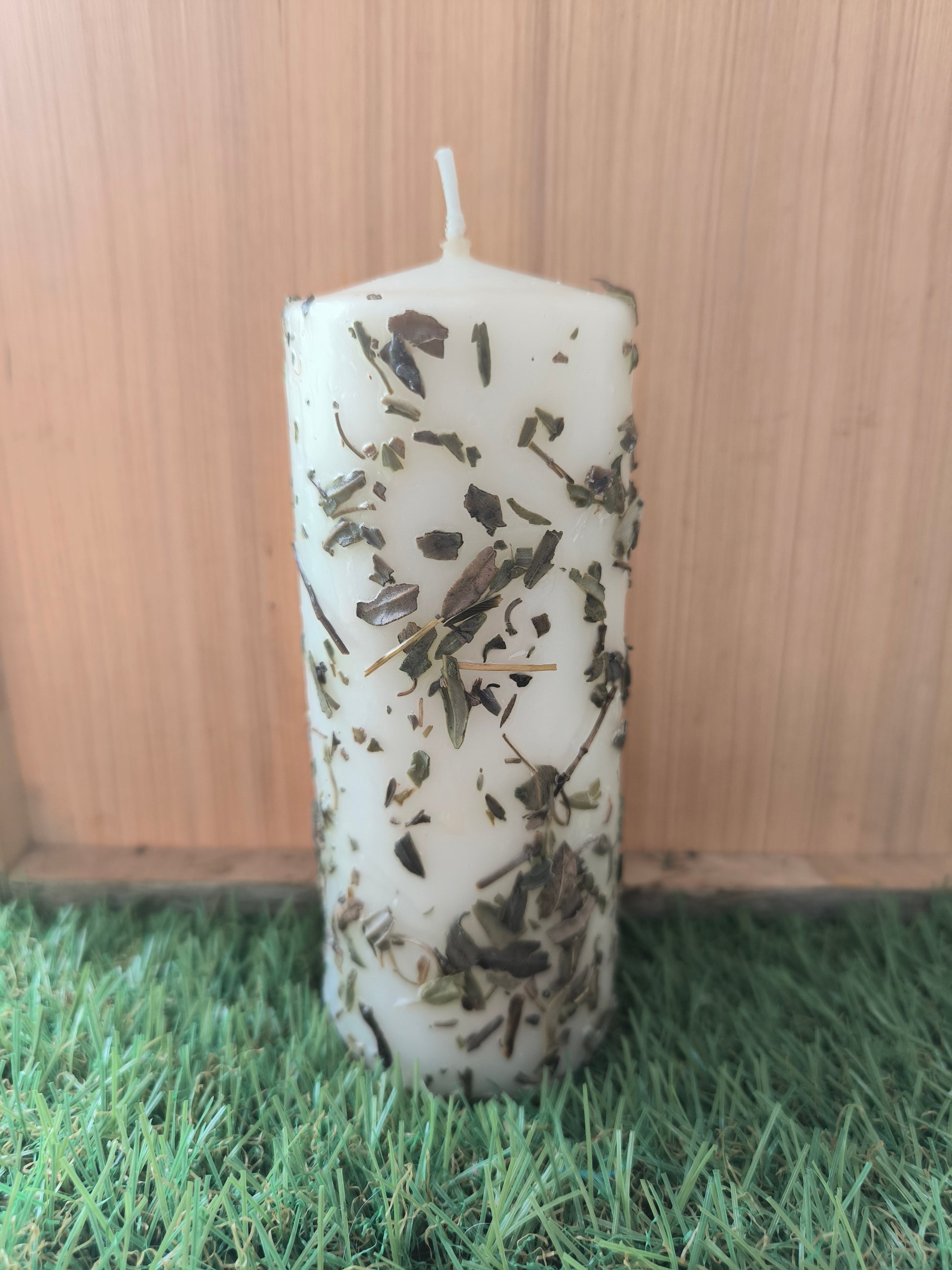 Velón Herbóreo Ritual elaborado con cera, aceites y hierbas naturales. Tamaño aproximado 5,5 cm x 20 cm.