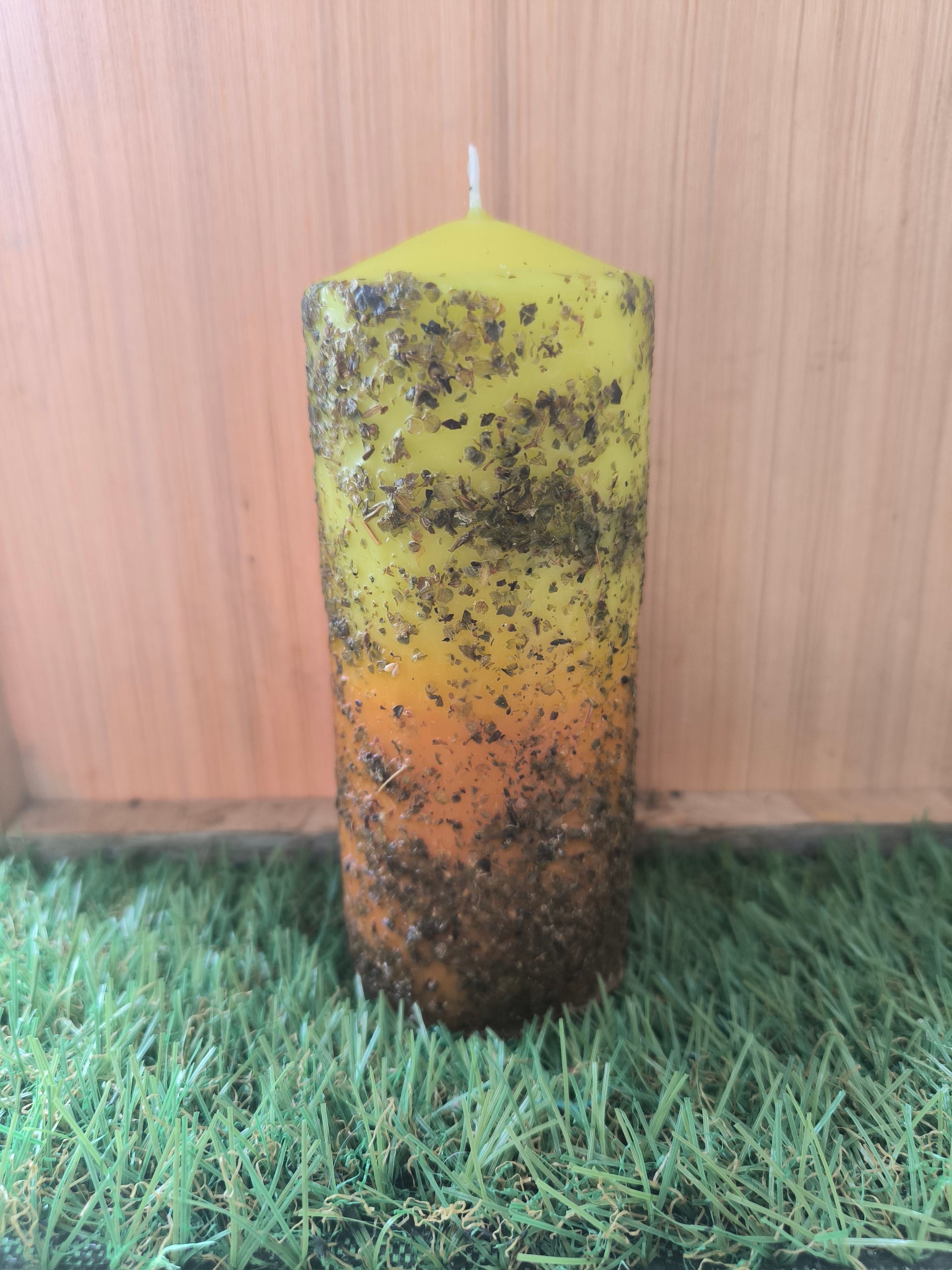 Velón Herbóreo Ritual elaborado con cera, aceites y hierbas naturales. Tamaño aproximado 5,5 cm x 20 cm.