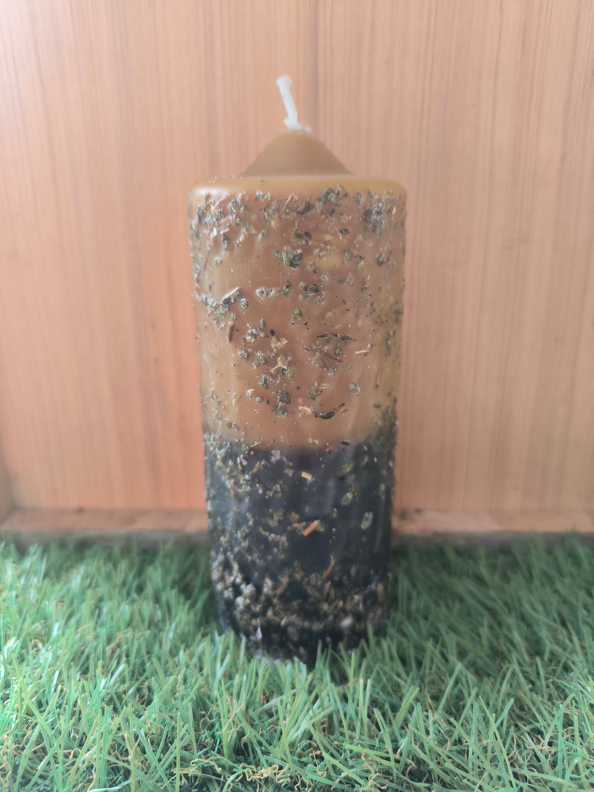 Velón Herbóreo Ritual elaborado con cera, aceites y hierbas naturales. Tamaño aproximado 5,5 cm x 20 cm.